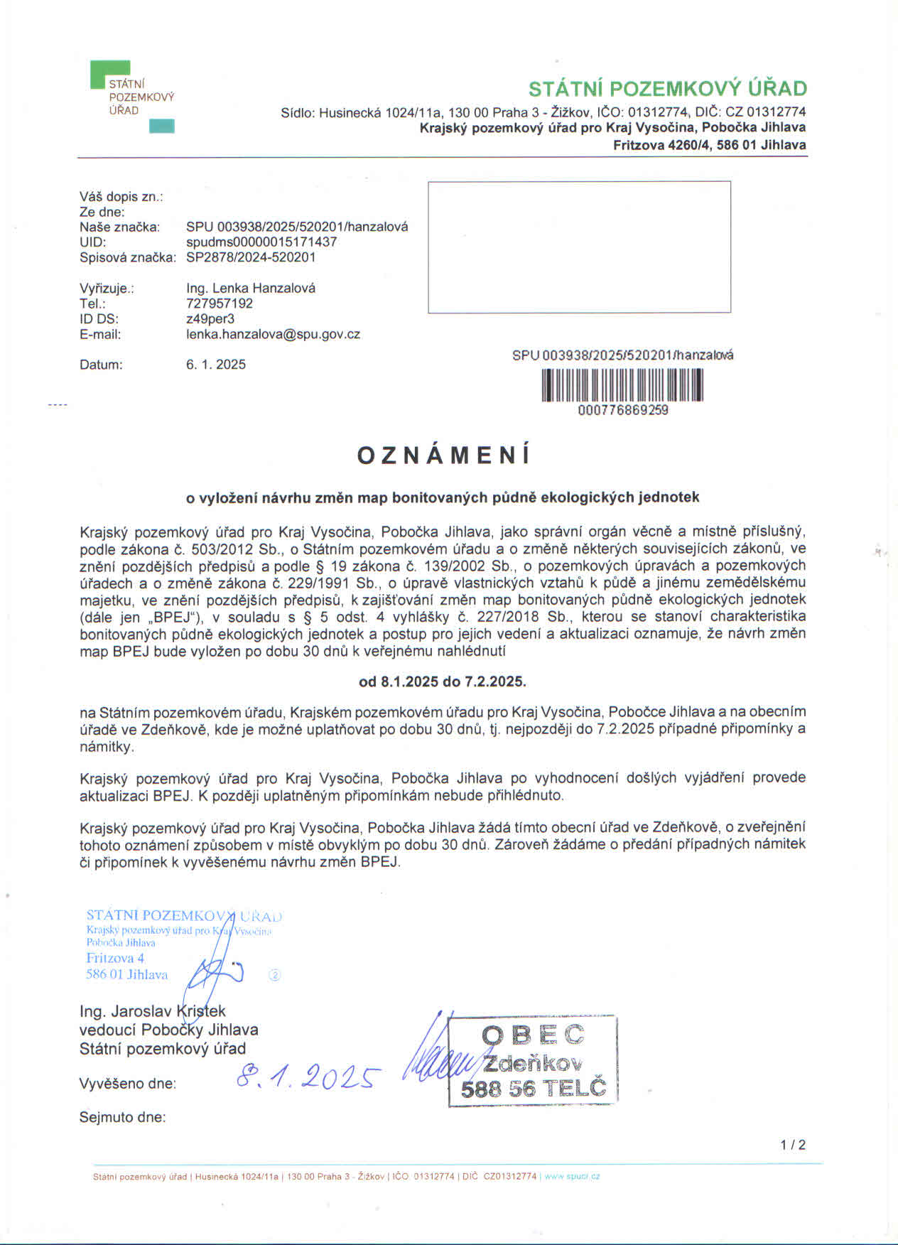 | 8. 1. 2025 | 10. 2. 2025 | Oznámení o vyložení návrhu změn map bonitovaných půdně ekologickýchjednotek [JPG, 205 kB] |